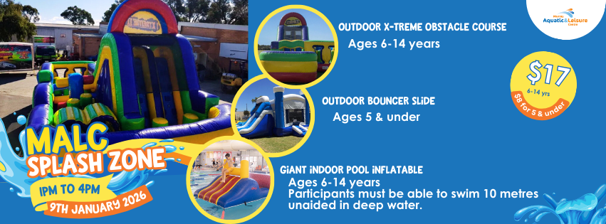 Join us on Friday, 9 January 2026, from 1pm to 4pm at MALC Pinjarra for the ultimate summer afternoon. Bring your crew, dive into the action, and enjoy a fun-packed session filled with water adventures, inflatable challenges, and good vibes all around.
