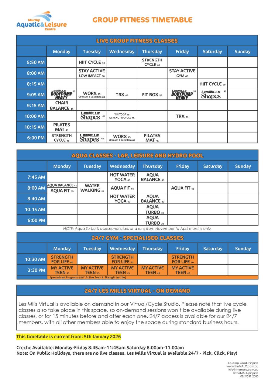 NOTE: Body Pump Heavy launches 12th January 2026. Additional Aqua Turbo Class commences 10:15am, 8th January 2026.
